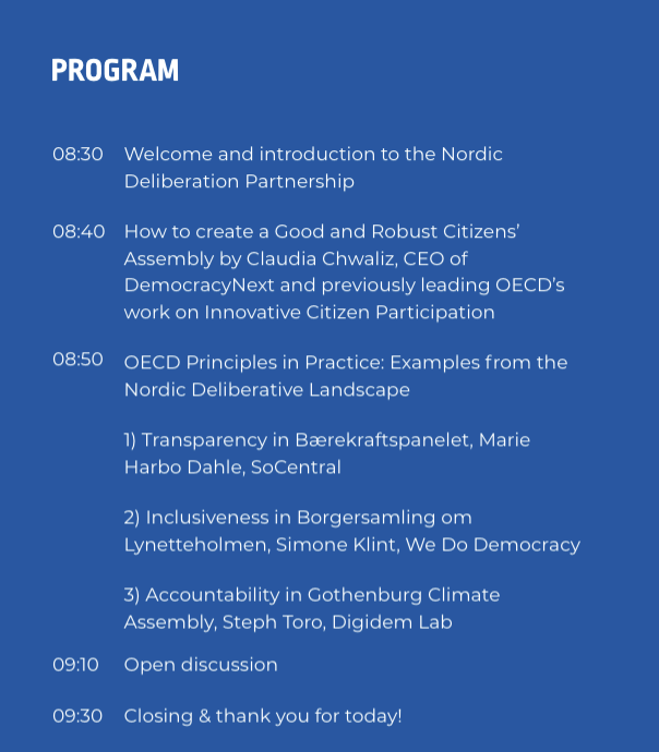Join us for a morning of introduction to the OECD principles for deliberative processes and shared exploration of the transformative potential of Citizens’ Assemblies in the Nordic landscape.